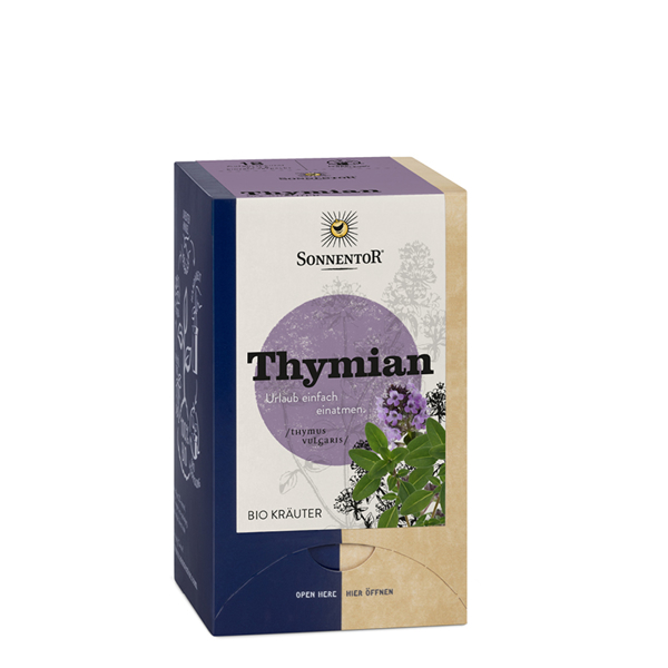 Urlaubserinnerungen in der Teetasse. Sonnentor Thymiantee schimmert in einem dunklen Gelb, duftet kräftig-würzig, ist vollmundig im Geschmack und überzeugt mit einem süsslichen Abgang. Besonders als Begleiter von Wild- und Pilzgerichten hat er sich bewährt. Mit seiner würzigen Note unterstreicht er deftige Aromen wunderbar. Er ist ein wertvoller Begleiter in der kalten Jahreszeit.